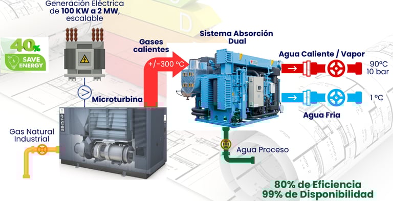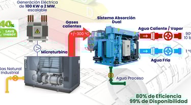 La cogeneración consiste en generar electricidad, calor simultáneamente a partir de un único proceso. En un sistema de cogeneración, una turbina de gas o microturbina produce electricidad y genera gases de escape calientes como subproducto. Estos gases de escape, que en un sistema convencional serían liberados al ambiente, son aprovechados para generar vapor o agua caliente, que puede ser utilizado para calefacción o en procesos industriales sin necesidad de consumir energía adicional.